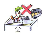 ![]() ・台所での調理屑、使用済みの油等は流さずに、新聞紙などにしみこませゴミと一緒に処分しましょう。 ・三角コーナーに細かいネットを置き、調理くずが流れ出ないようにしましょう。 |