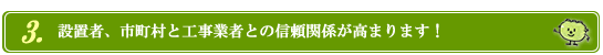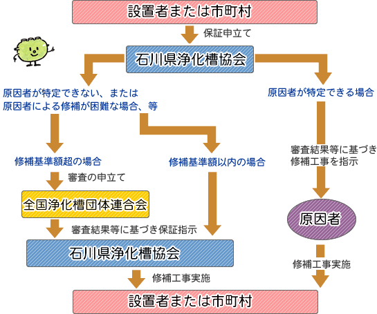 | (一社)全国浄化槽団体連合会では、設置者に浄化槽の正常な機能を保証し、安心して使用していただくため、平成5年度より浄化槽機能保証制度を実施しています。 この制度は、(一社)全国浄化槽団体連合会に保証登録された浄化槽に機能異常が発生した場合には、その原因者を明らかにして当該原因者による修補等の措置を確保するとともに、原因者が特定できない、または原因者による措置を講ずることが著しく困難である場合には、(一社)全国浄化槽団体連合会に設けられた保証基金によりその修補に要する費用を支払うものです。 |