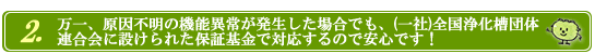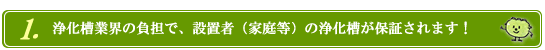 | 1.保証制度の対象となる浄化槽 対象となる浄化槽は、次の2つの要件に合致するものです。 ●全国合併処理浄化槽普及促進市町村協議会の実施する登録制度により登録された浄化槽であること ●各都道府県浄化槽協会を通じて全浄連が保証登録を行った浄化槽であること