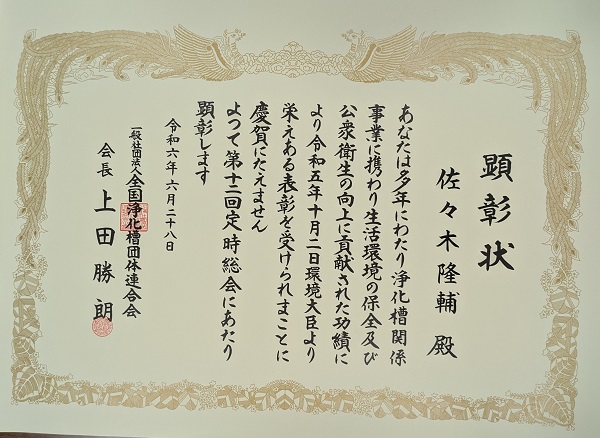 一般社団法人全国浄化槽団体連合会より、当協会の佐々木隆輔理事(ニッコー株式会社)に