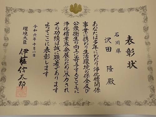 一般社団法人全国浄化槽団体連合会より、当協会の沢田隆専務理事(有限会社フゲシ環境サービス)に